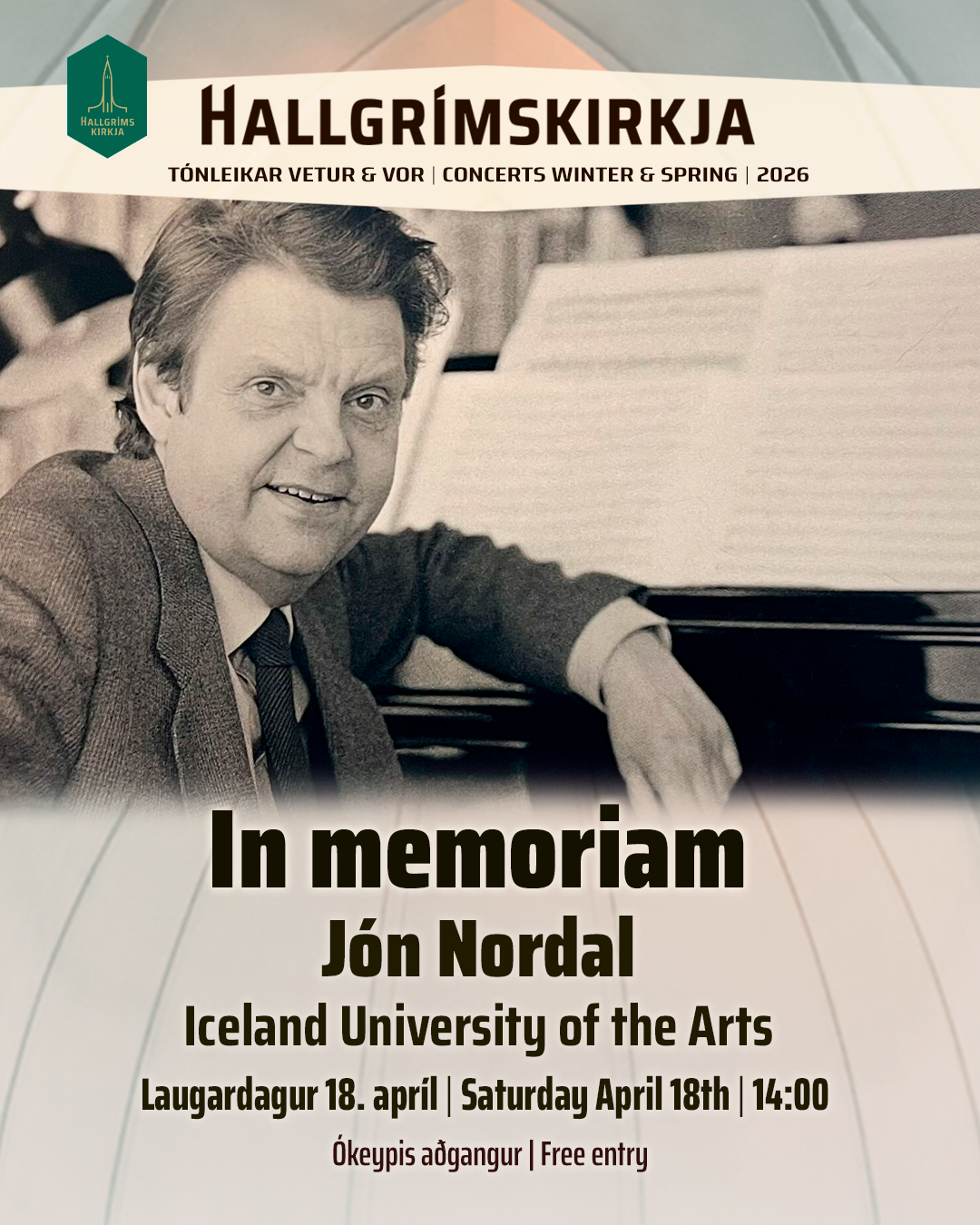 Hallgrímskirkja, in collaboration with the Music Department of the Iceland University of the Arts, will host a concert on April 18 in celebration of the 100th anniversary of the birth of Icelandic composer Jón Nordal.